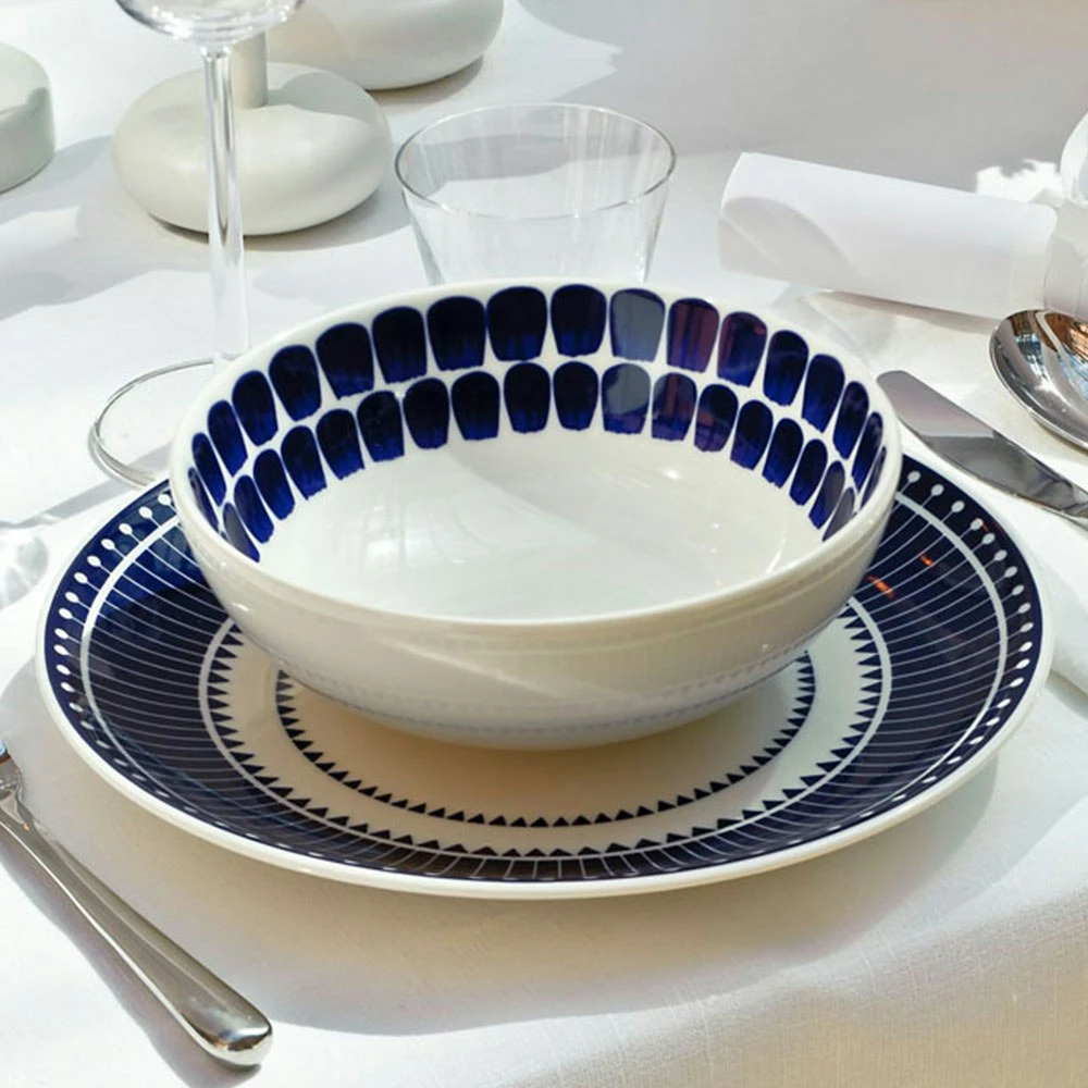 Schüssel von Arabia. Diese Schüssel gehört zur beliebten 24-Stunden-Tuokio-Serie, die sich durch zeitloses Design und das ikonische blau-weiße Muster auszeichnet. Das Muster ist von der 140-jährigen Geschichte Arabias inspiriert und vermittelt ein Gefühl für handgemalte Pinselstriche. Es ist das finnische Duo Helorinne und Kallio, die die 24-Stunden-Serie von Heikko Orvala interpretiert haben. Der Name 24h kommt von der Tatsache, dass die Schüssel zu jeder Tageszeit verwendet werden kann.