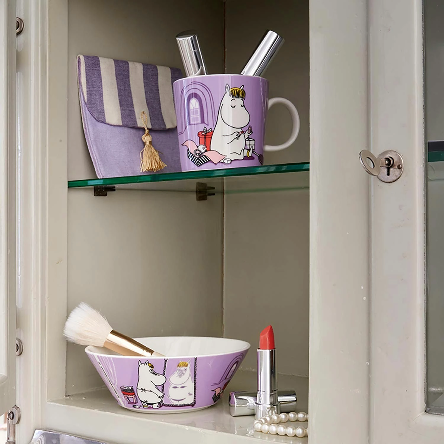 Die Moomin Bowl Snorkfräulein von Arabia ist mit einem Motiv geschmückt, das aus dem klassischen Buch „Mumin an der Riviera“ von 1955 stammt. Das Buch handelt von dem Mal, als Familie Mumin nach Frankreich segelt und das Snorkfräulein im Casino Geld gewinnt. Für das Geld kauft sie einen schönen Bikini. Das Motiv auf einer Seite der Schale zeigt, wie sie ihren Bikini probiert, und auf der anderen Seite, wie sie einen neuen Lippenstift testet. Die Originalzeichnungen stammen von Tove Jansson.
