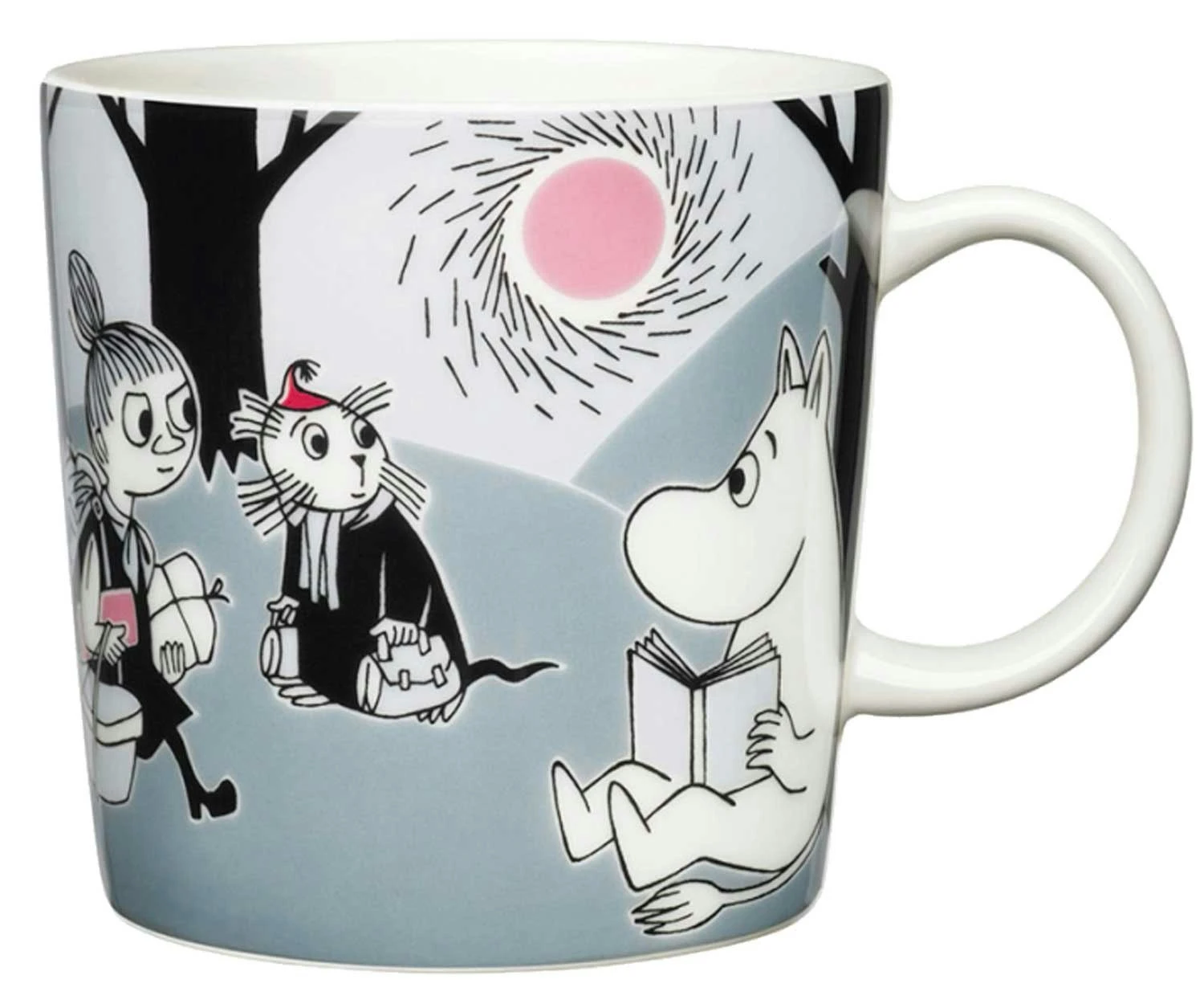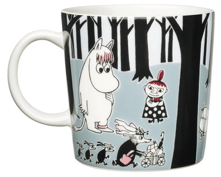 Mumin Tasse von Arabia. Dies ist eine verspielte Tasse mit Motiven aus Tove Janssons Geschichten von Abenteuern von Mumin und seinen Freunden aus dem Mumintal.