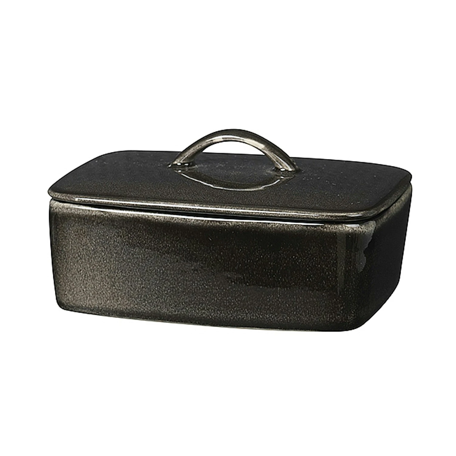Butterdose von Broste Copenhagen. Dies ist eine wunderschöne und rustikale Butterdose, die zur Nordic Coal-Serie gehört. Sie besteht aus glasiertem Steinzeug und ist in einer tiefschwarzen Farbe lackiert. Inspiriert von Naturkräften und Rohstoffen hebt sich diese Butterdose definitiv von der Masse ab und schafft eine aufregende Tischdekoration. Da sie handgefertigt ist, kann es zu Variationen in der Textur und Farbe kommen. Dies macht jedes Exemplar einzigartig.