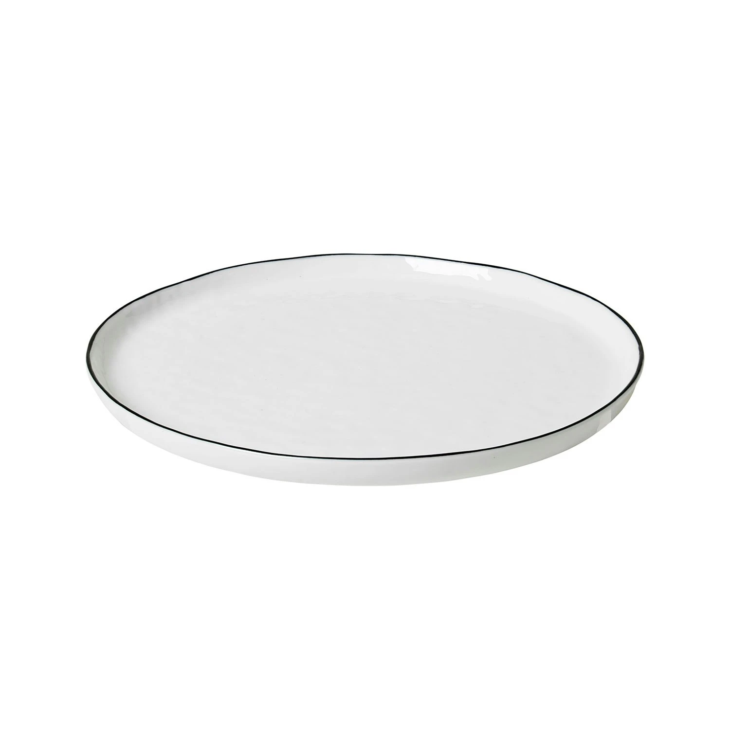 Rustikaler Teller von Broste Kopenhagen. Dies ist ein Teller aus Steinzeug, der mit einer weißen Farbe glasiert wurde. Als Inspiration dient das natürliche Mineralsalz. Der schwarze Rand ist handbemalt und verleiht dem Teller ein rustikales Flair. Es ist handgefertigt und kann in der Farbe variieren, was jede Platte einzigartig macht.