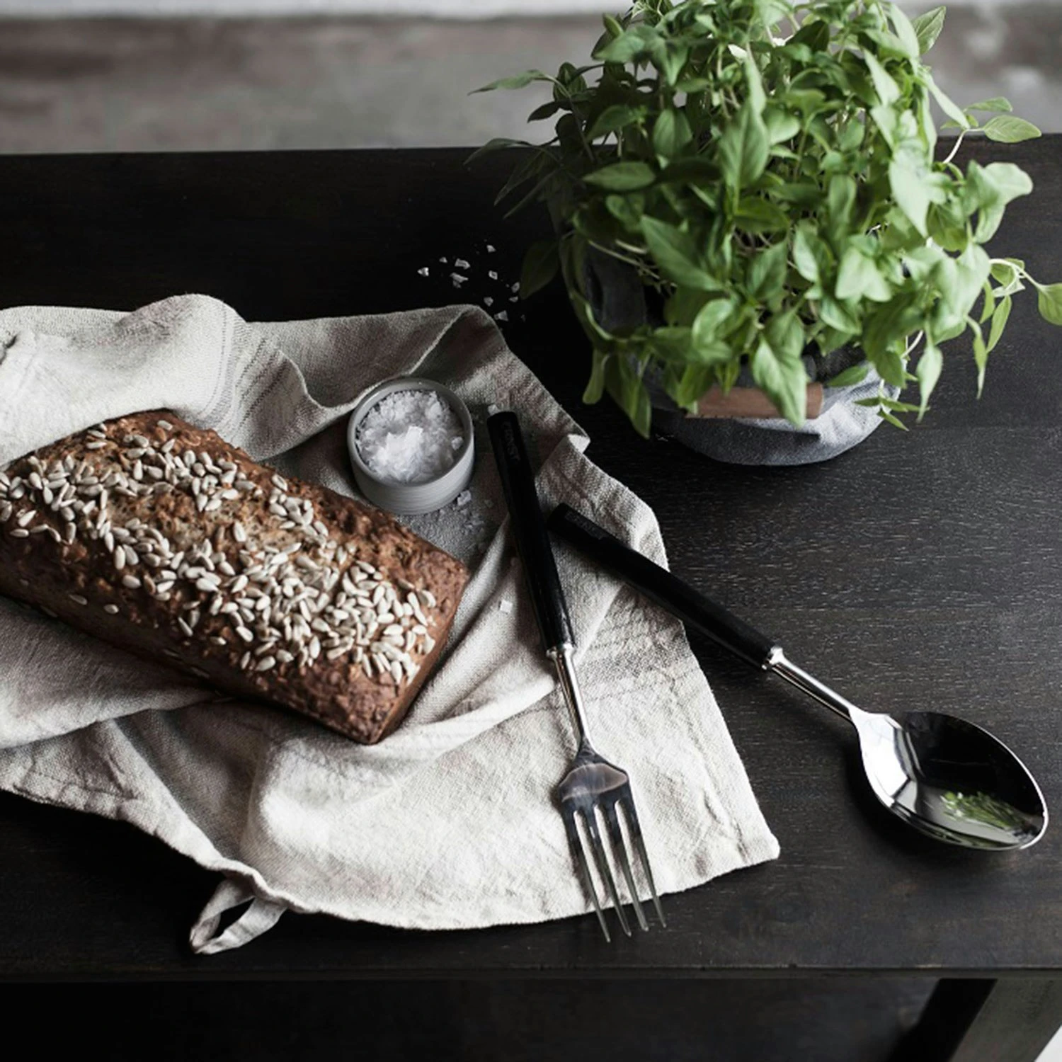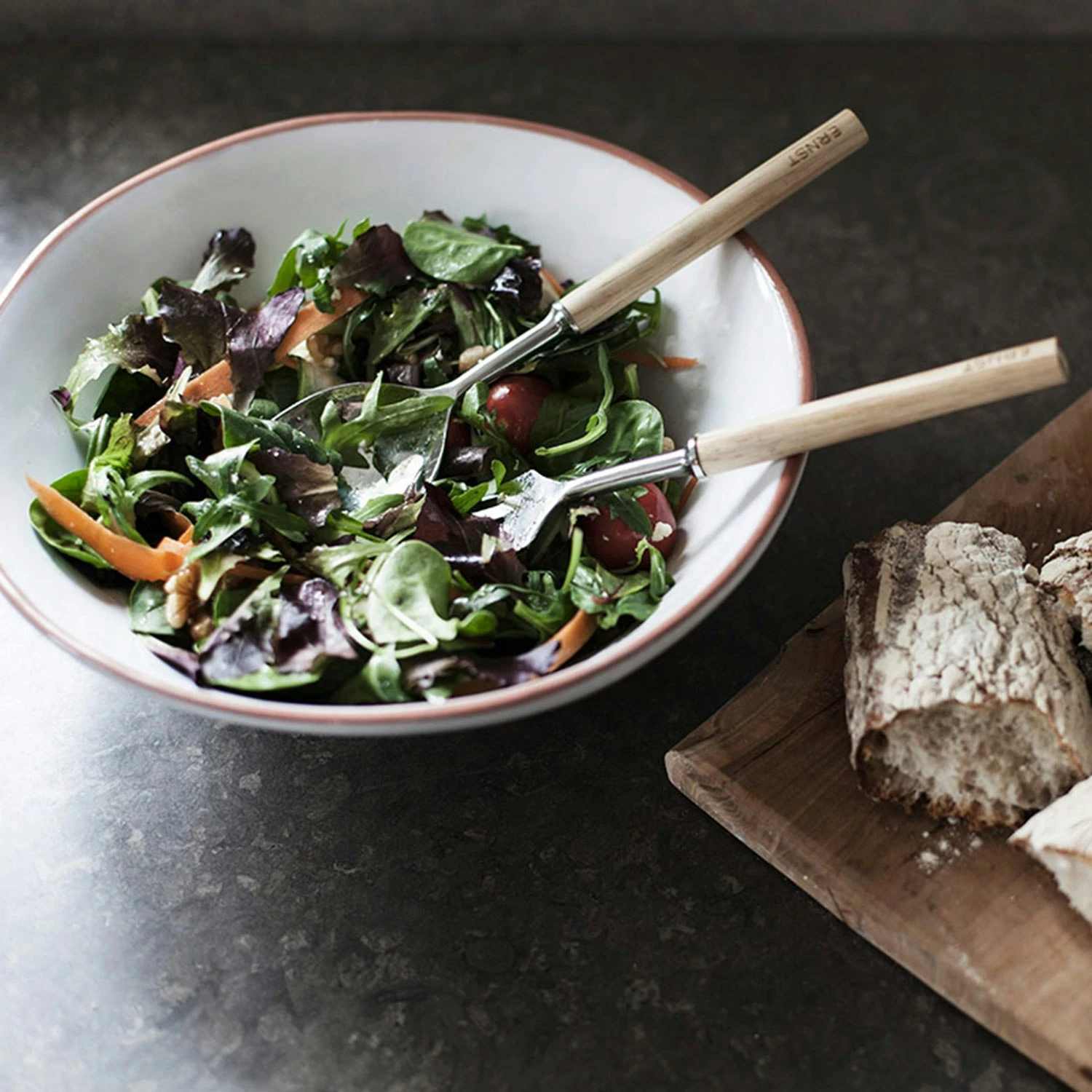 Ein Salatbesteck, das ein eleganteres Gefühl vermittelt, sobald der Salat auf dem Teller landet. Das Besteck ist in zwei verschiedenen Farben erhältlich: Schwarz und Holz.